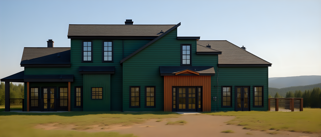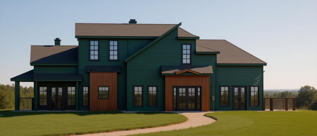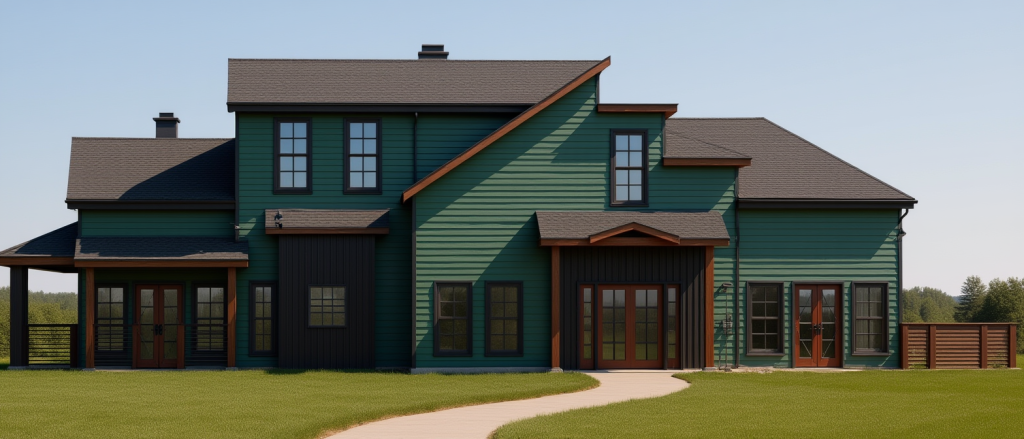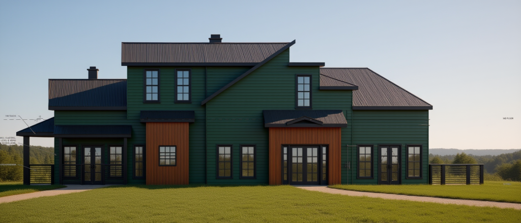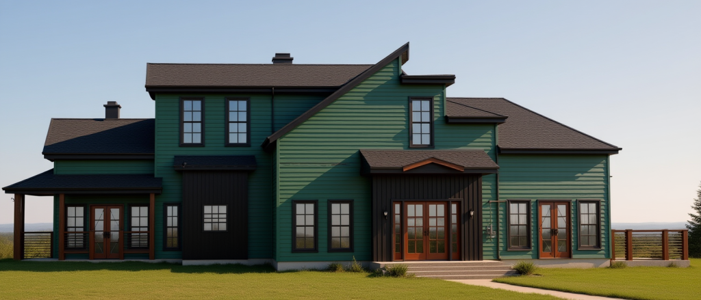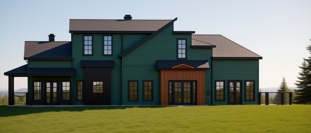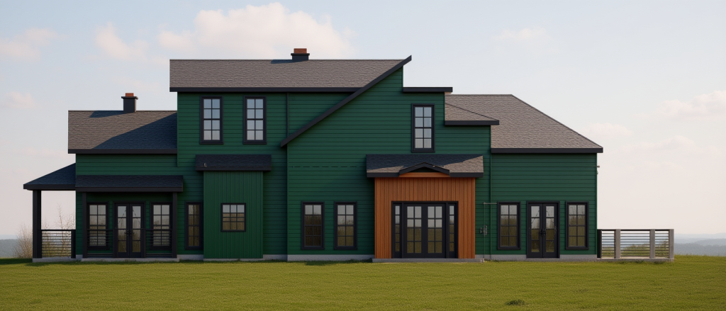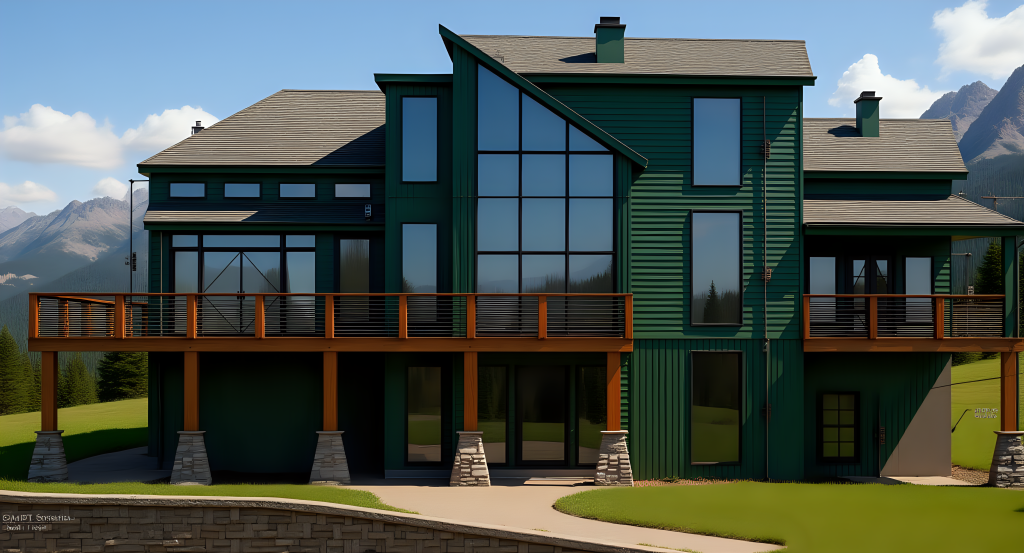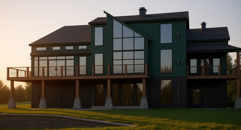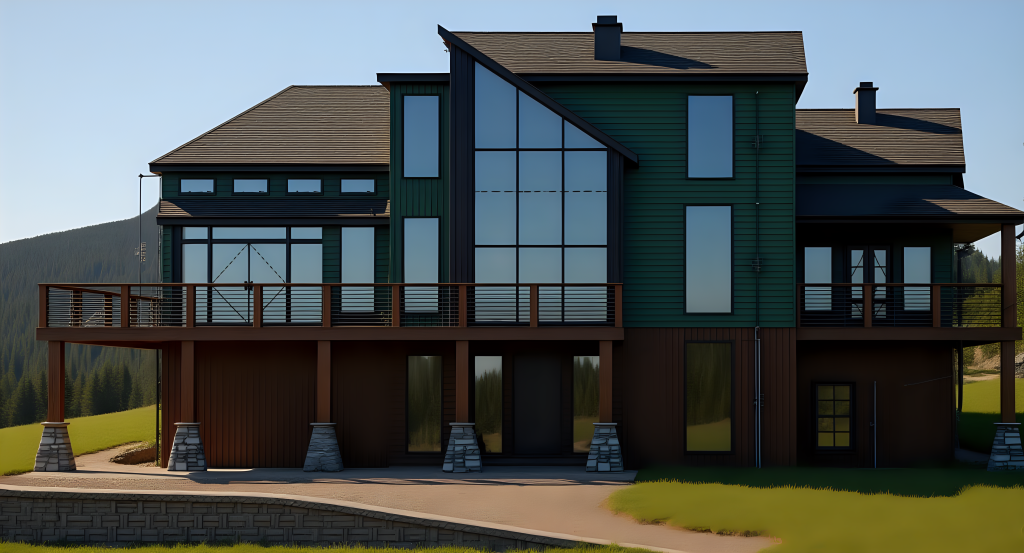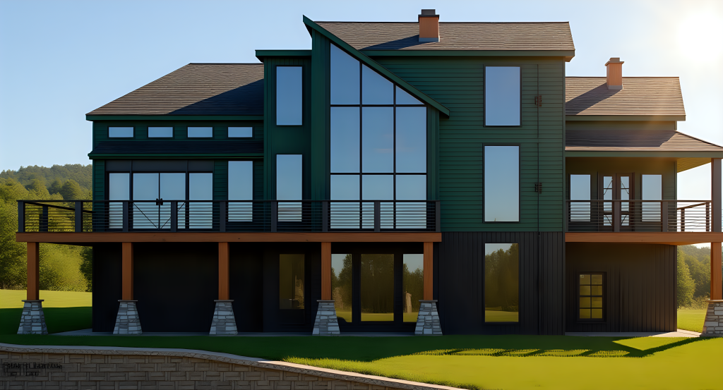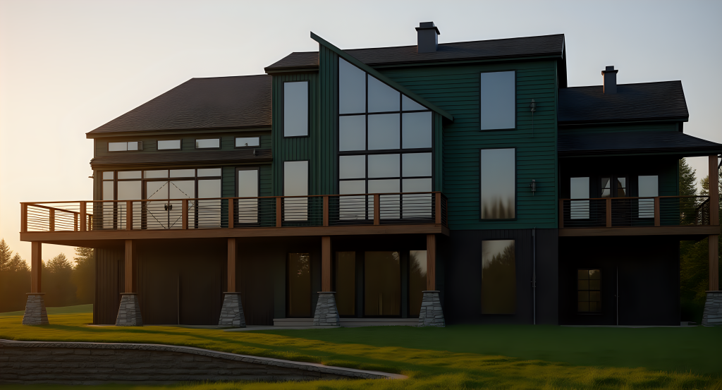 photorealistic rendering of a modern multi-story house based on the architectural sketch. The structure features a extensive glass windows, and aluminum clad siding leaning towards black and hunter green with some natural wood tones. The house is situated on a gentle slope with realistic ground texture and light landscaping. The image should appear as a professional architectural photograph, highly detailed and true to the sketch. the house is well lighted without any shadows.