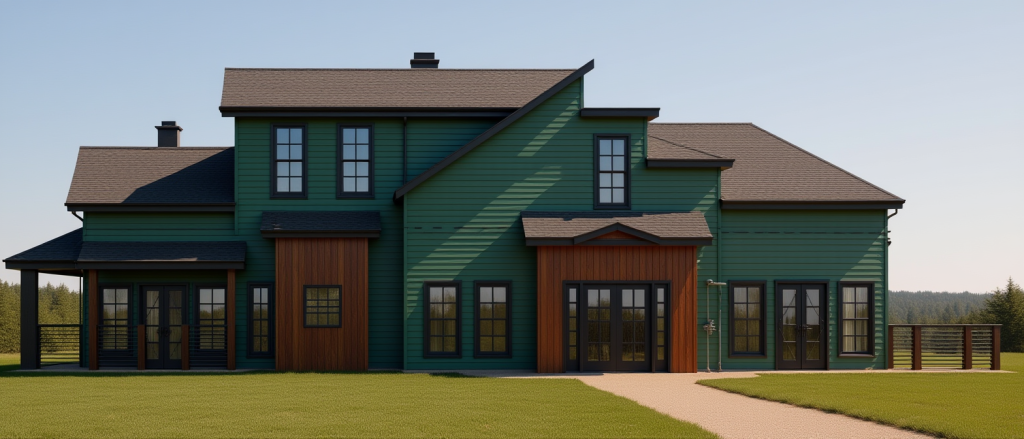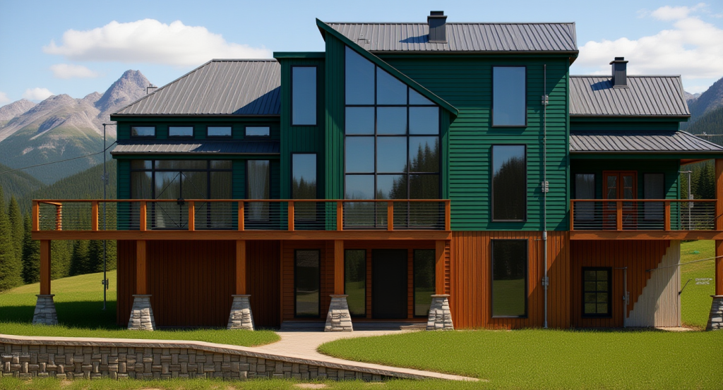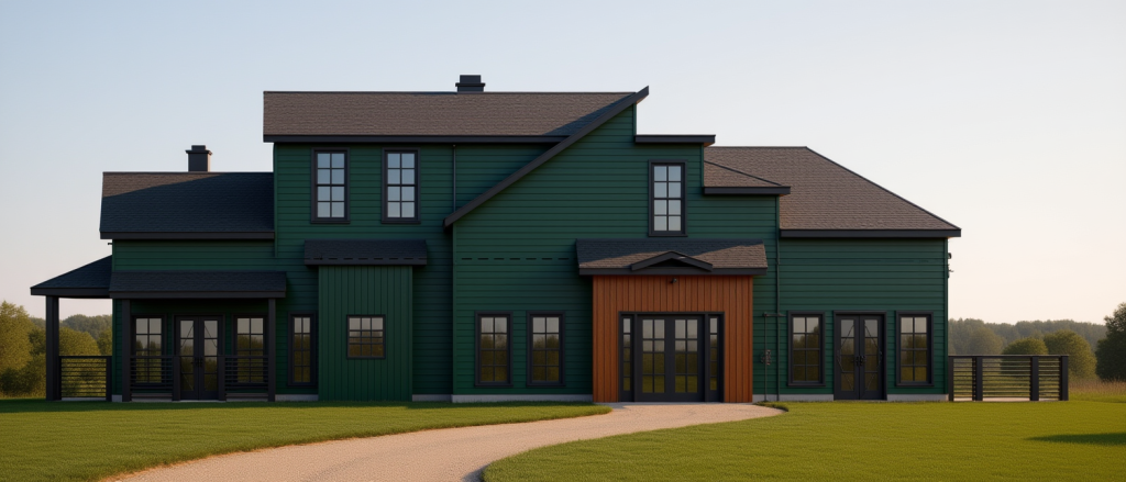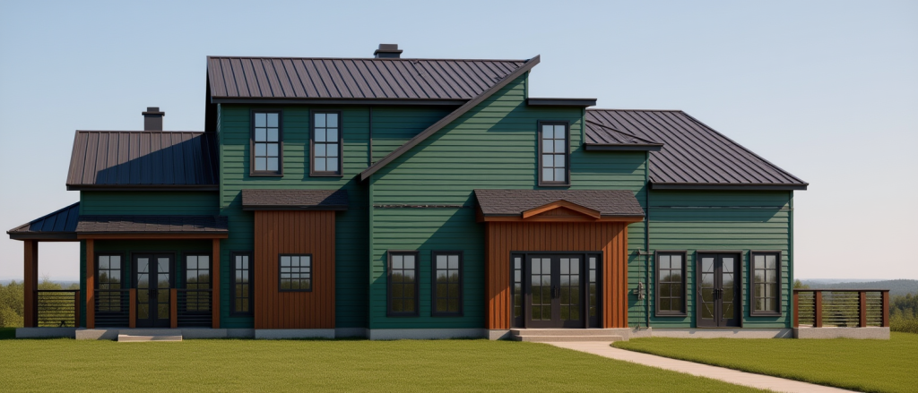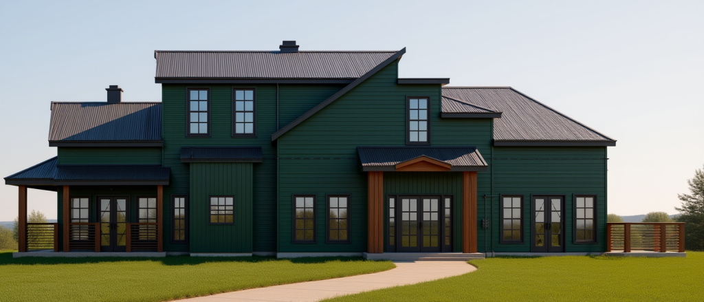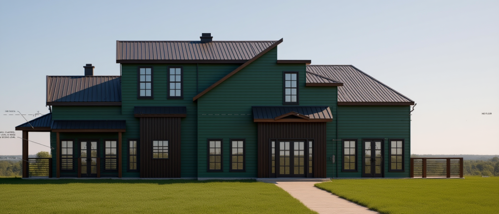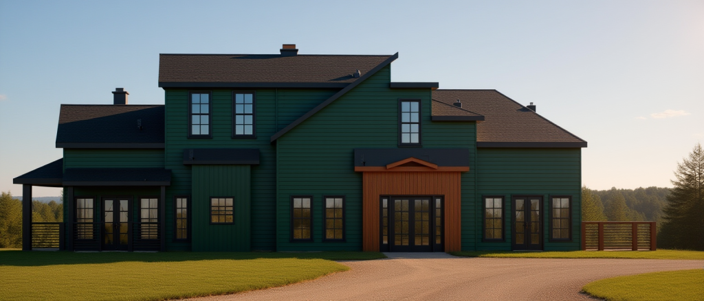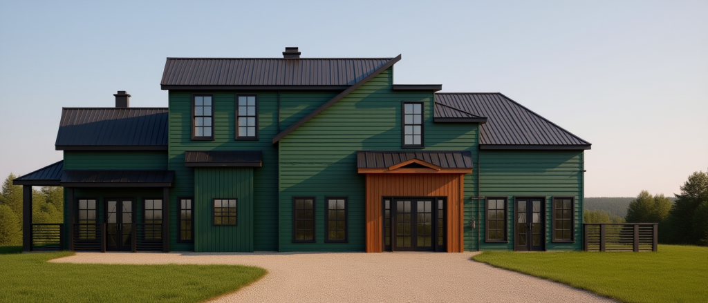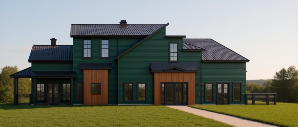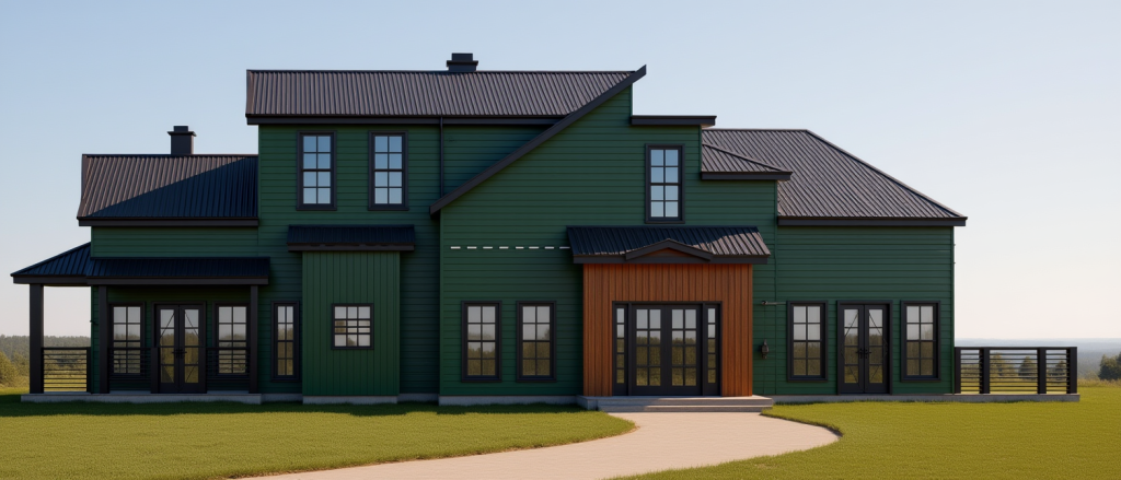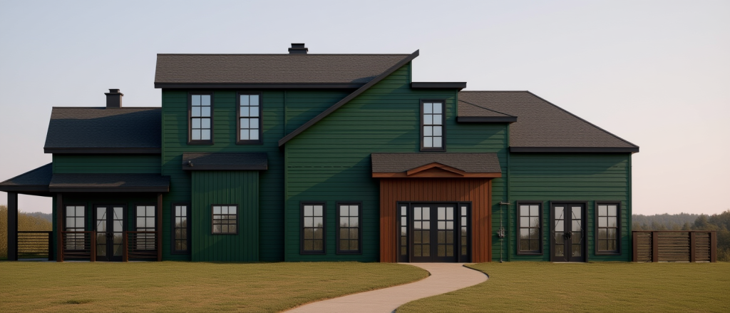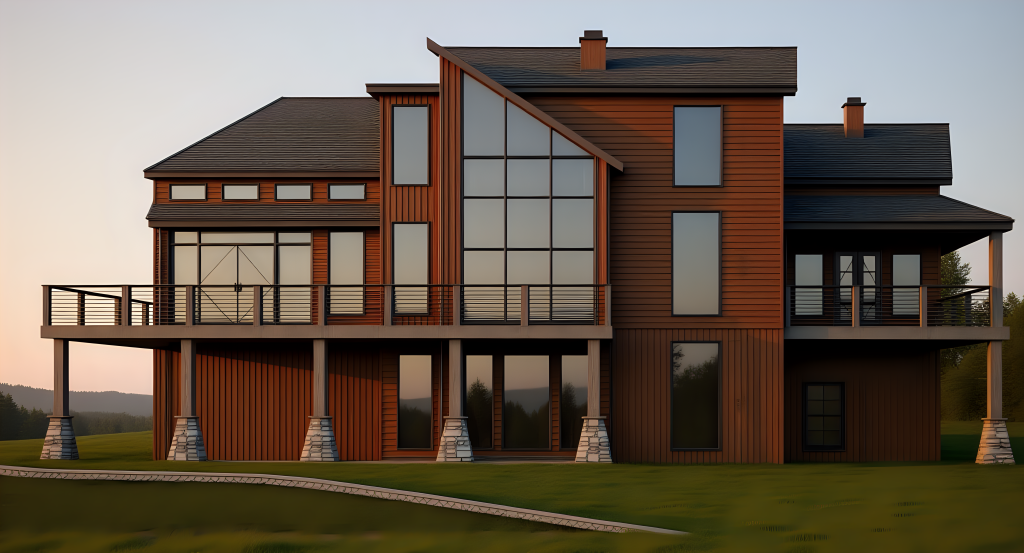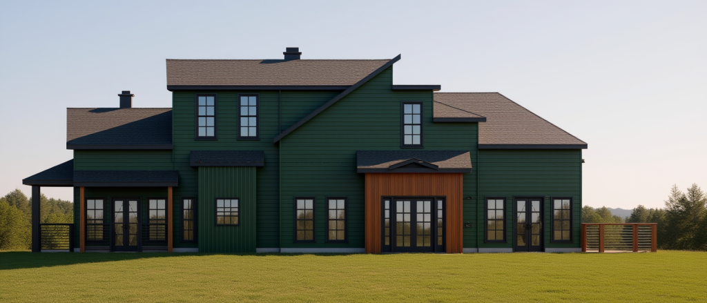 photorealistic rendering of a modern multi-story house based on the architectural sketch. The structure features a extensive glass windows, and aluminum clad siding leaning towards black and hunter green with some natural wood tones. The house is situated on a gentle slope with realistic ground texture and light landscaping. The image should appear as a professional architectural photograph, highly detailed and true to the sketch. the house is well lighted without any shadows.