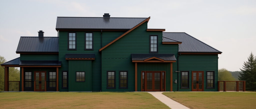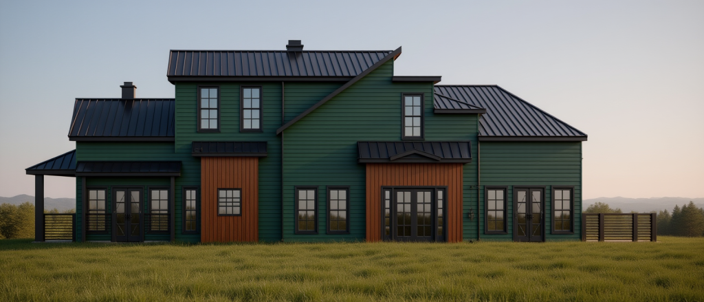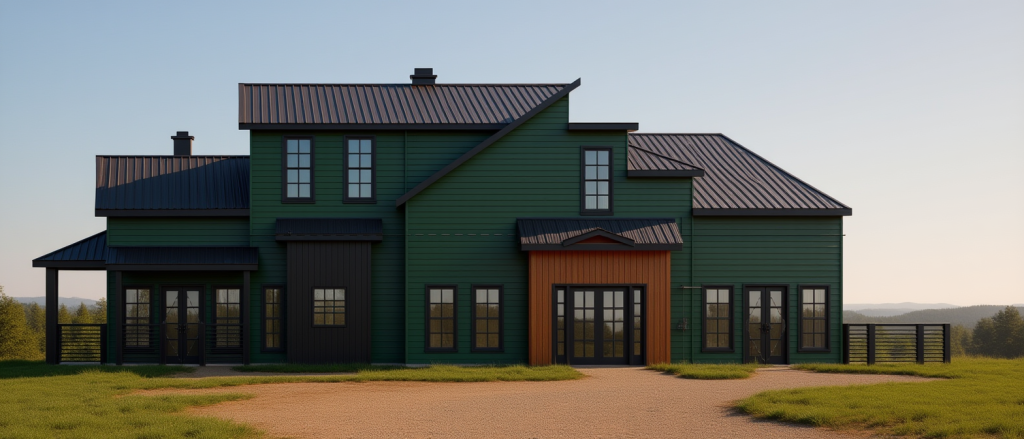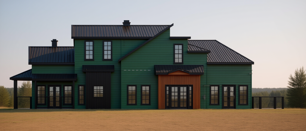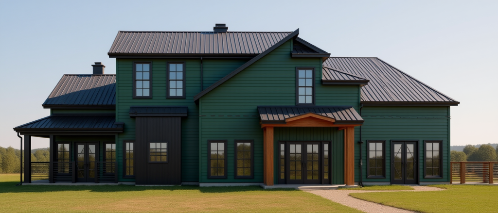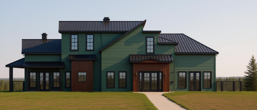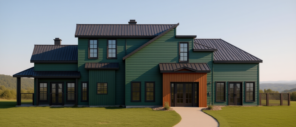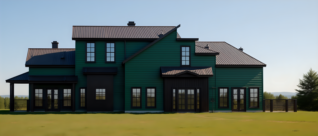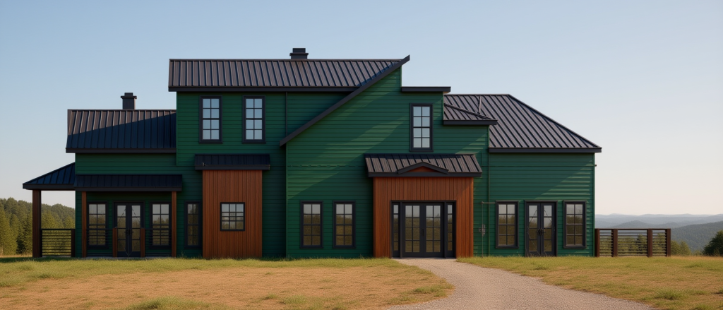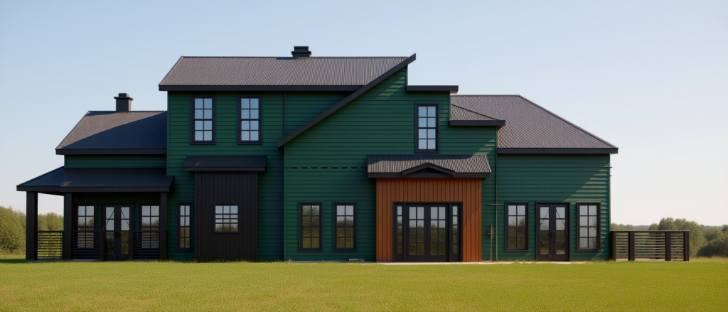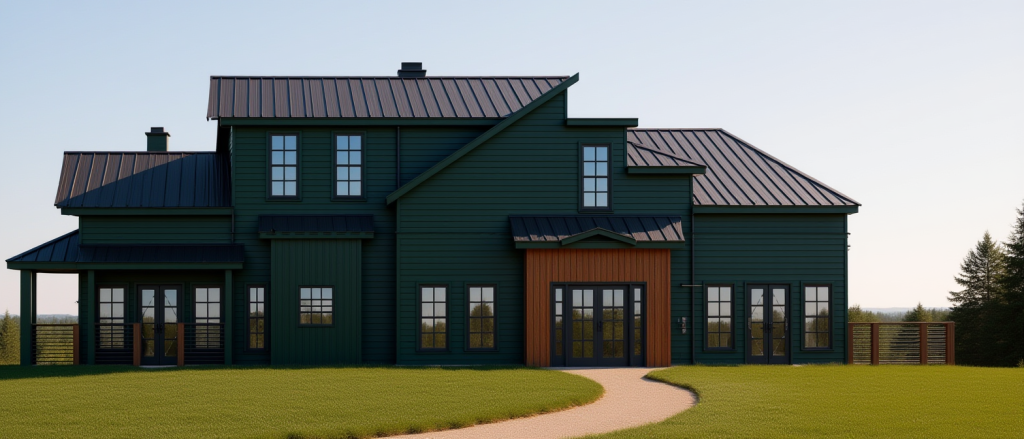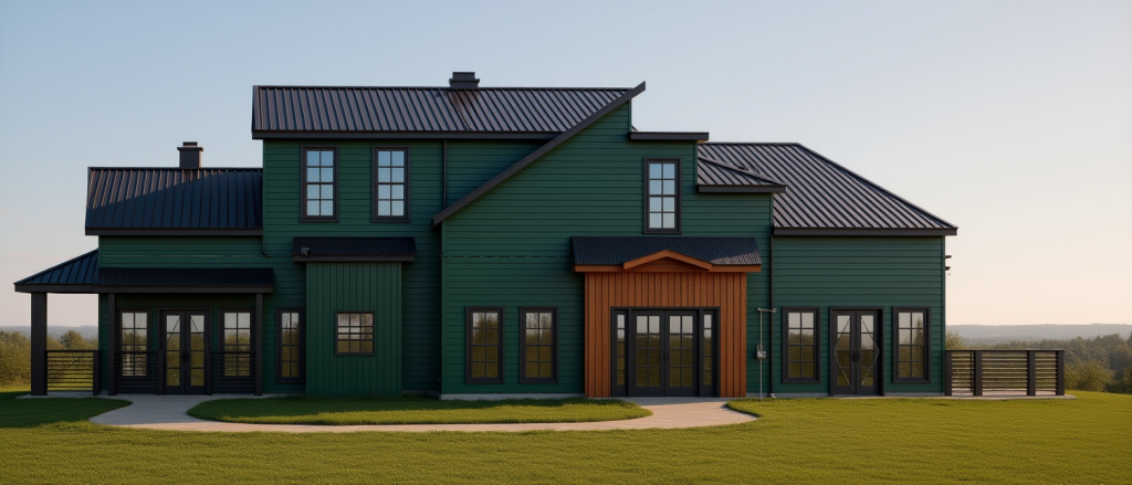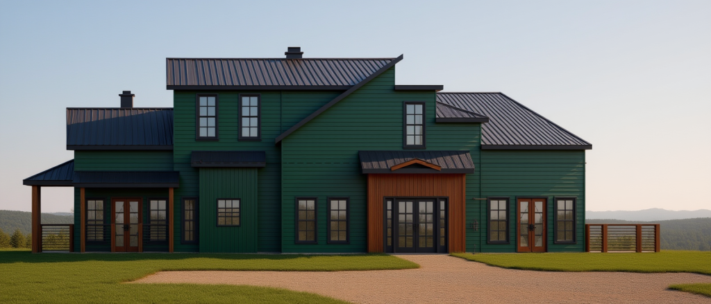 photorealistic rendering of a modern multi-story house based on the architectural sketch. The structure features a extensive glass windows, and aluminum clad siding leaning towards black and hunter green with some natural wood tones. The house is situated on a gentle slope with realistic ground texture and light landscaping. The image should appear as a professional architectural photograph, highly detailed and true to the sketch. the house is well lighted without any shadows.