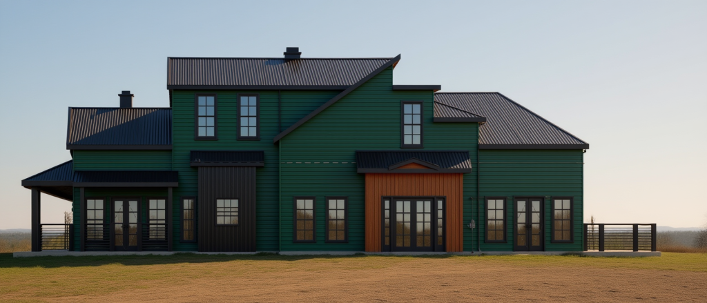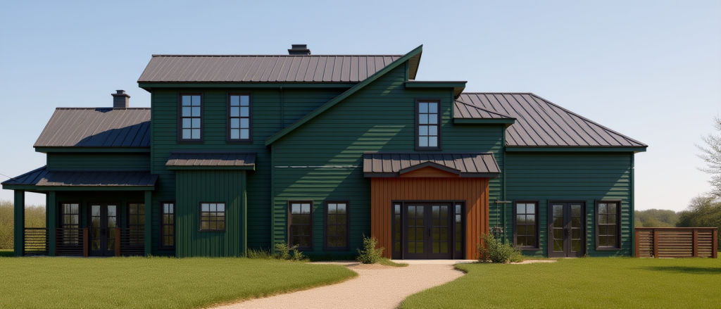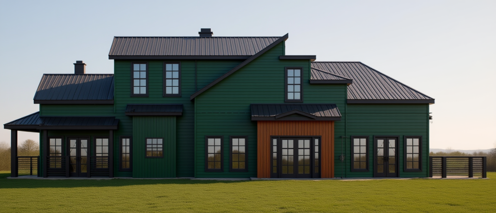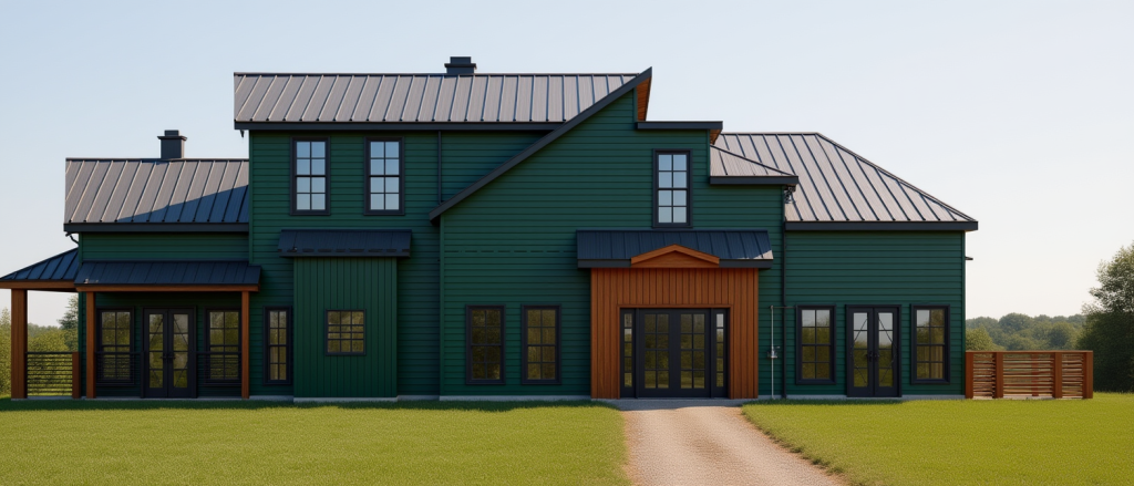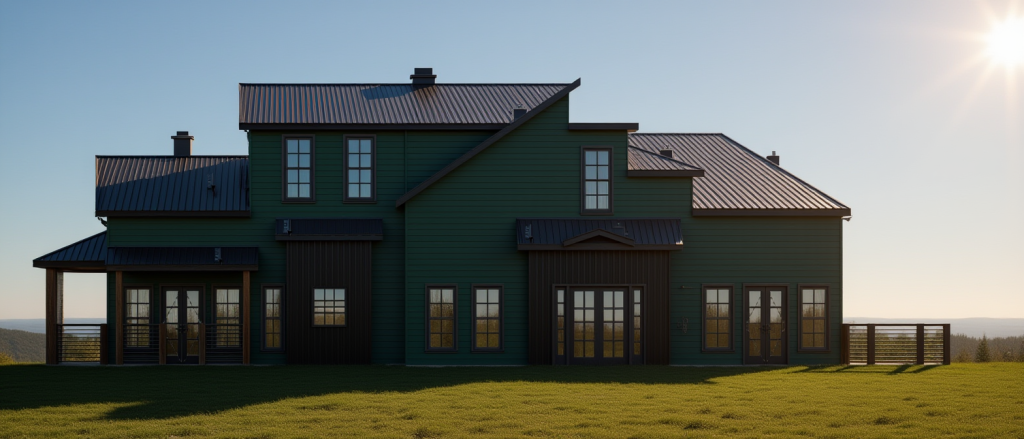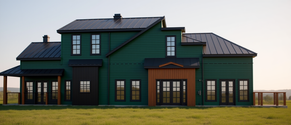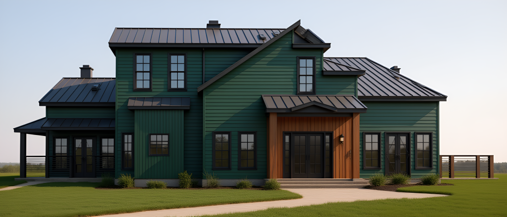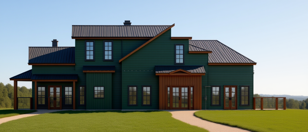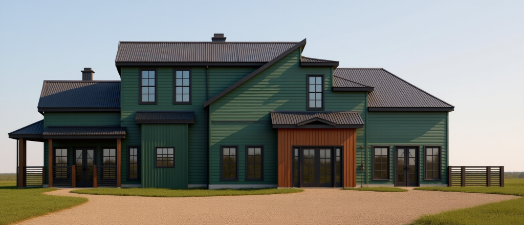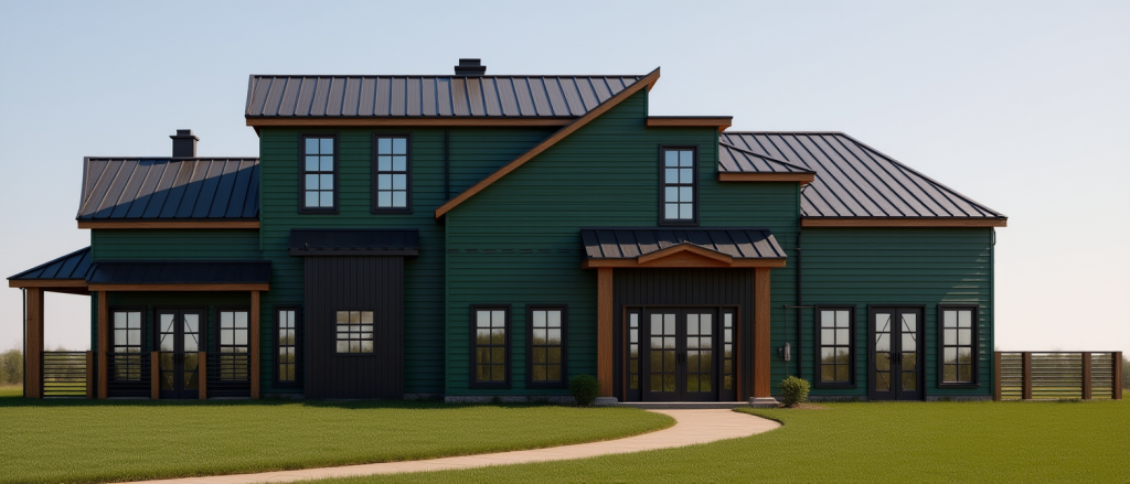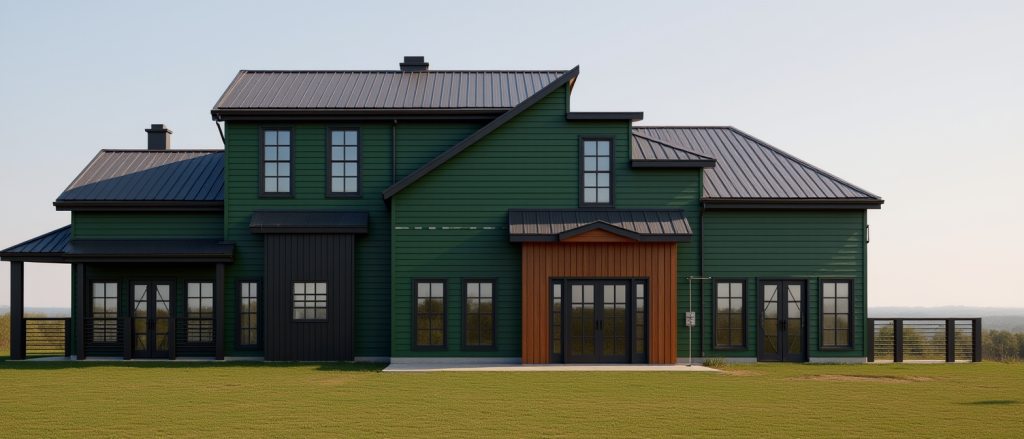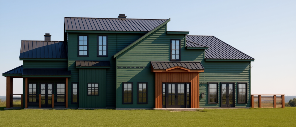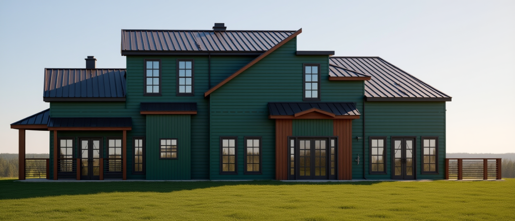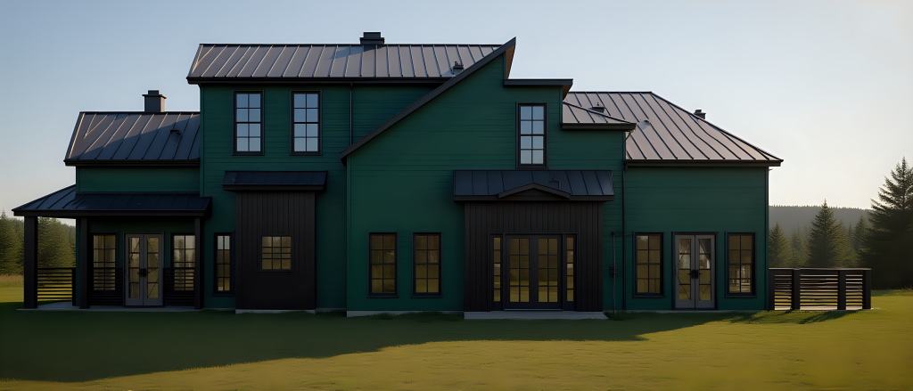 photorealistic rendering of a modern multi-story house based on the architectural sketch. The structure features a extensive glass windows, and aluminum clad siding leaning towards black and hunter green with some natural wood tones. The house is situated on a gentle slope with realistic ground texture and light landscaping. The image should appear as a professional architectural photograph, highly detailed and true to the sketch. the house is well lighted without any shadows.