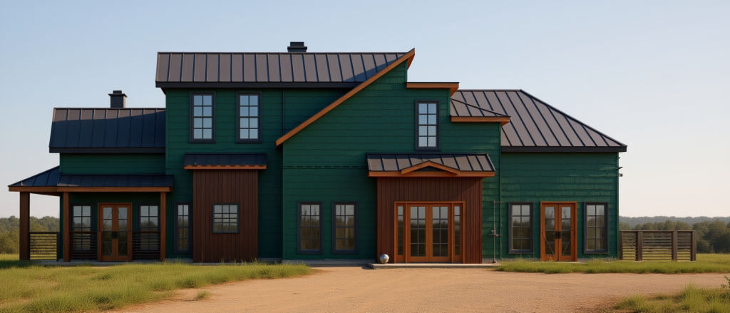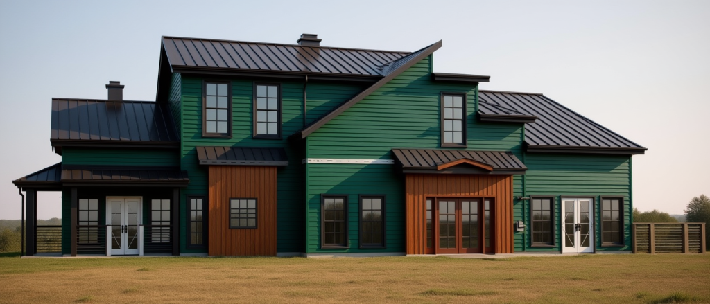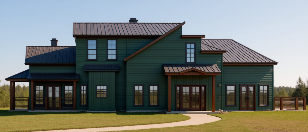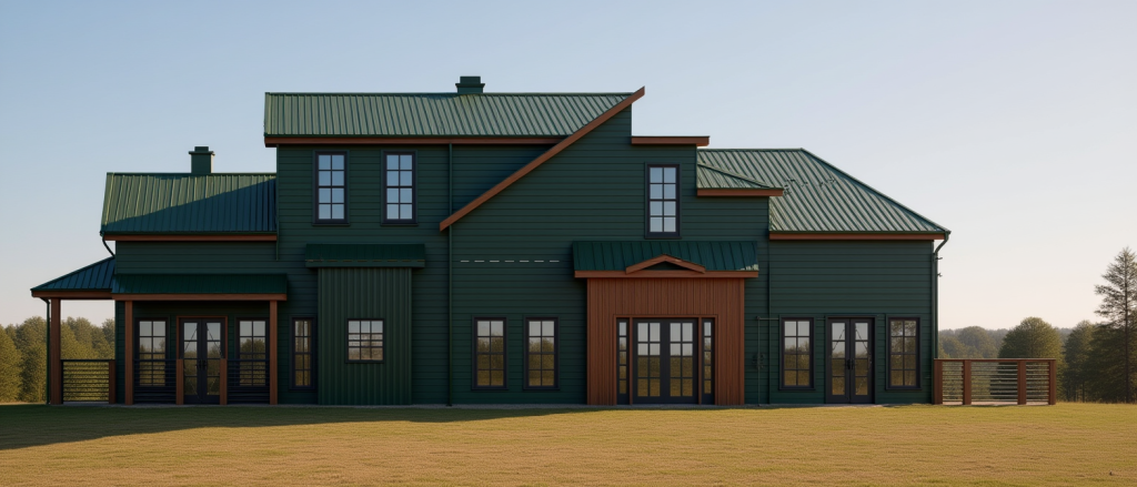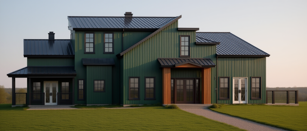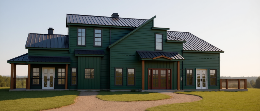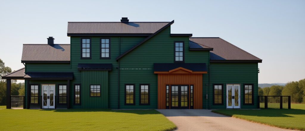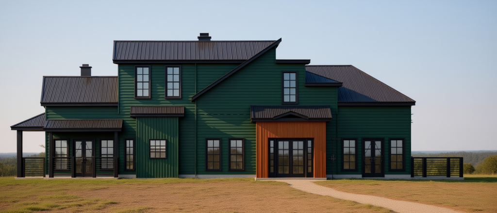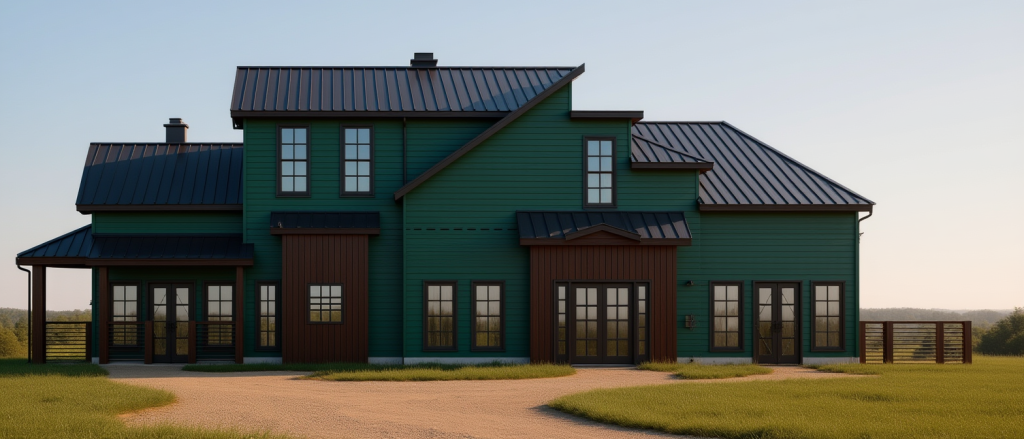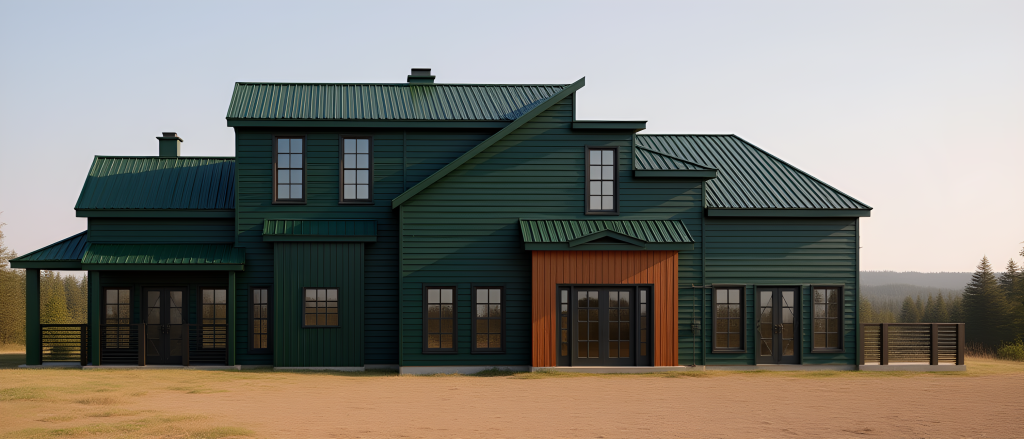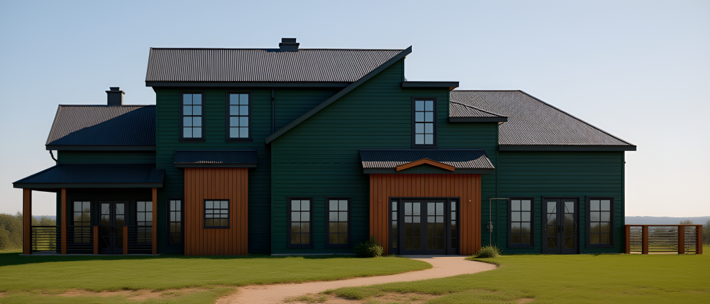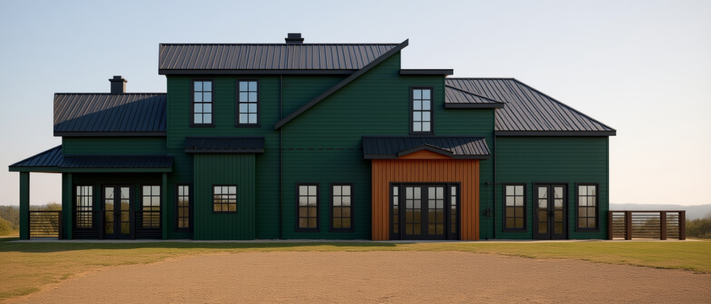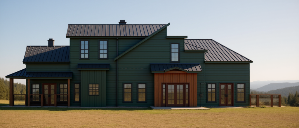 photorealistic rendering of a modern multi-story house based on the architectural sketch. The structure features a extensive glass windows, and aluminum clad siding leaning towards black and hunter green with some natural wood tones. The house is situated on a gentle slope with realistic ground texture and light landscaping. The image should appear as a professional architectural photograph, highly detailed and true to the sketch. the house is well lighted without any shadows.